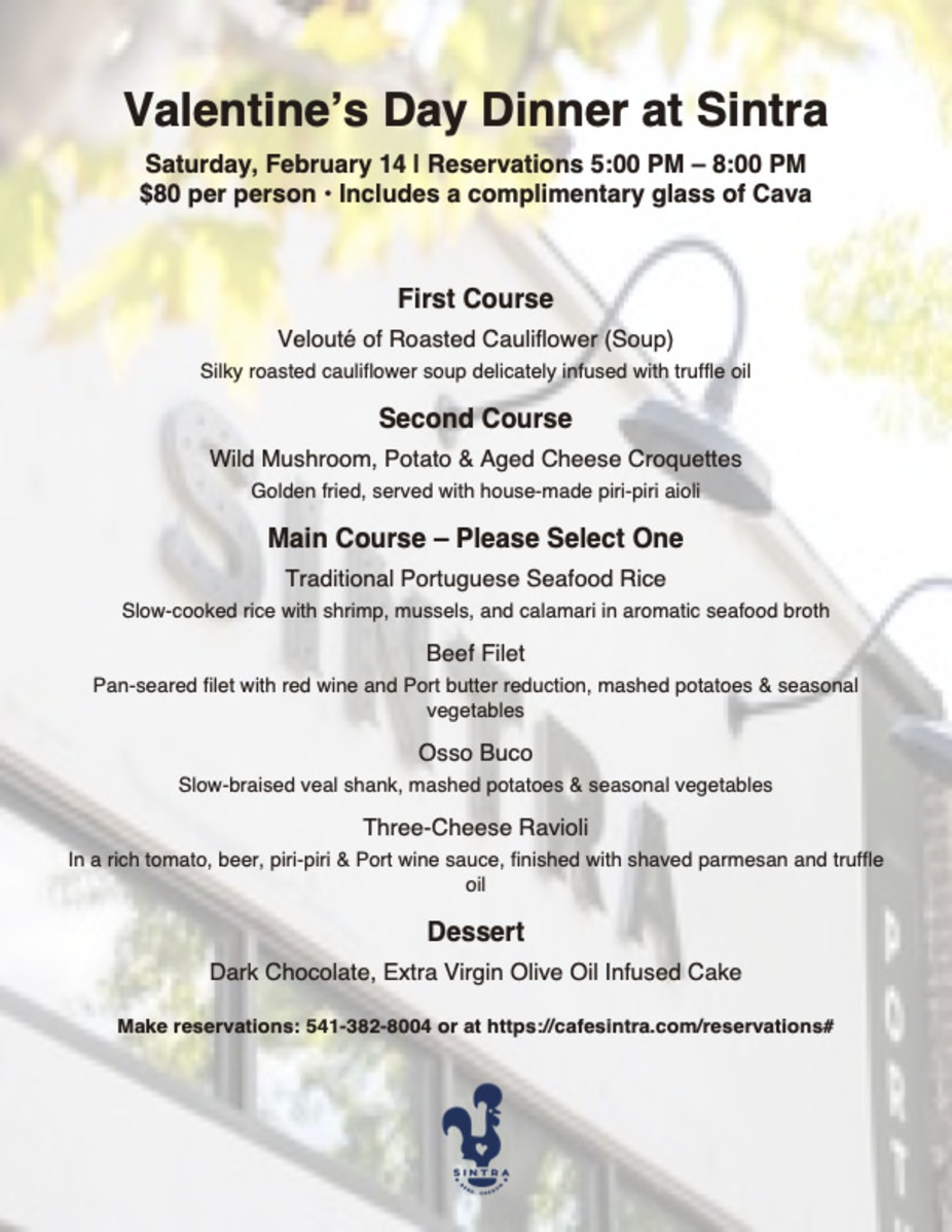 Join us for a special Valentine’s Day Dinner at Sintra. Enjoy a romantic four-course prix fixe menu, beginning with a complimentary glass of Cava and featuring classic Portuguese-inspired dishes, decadent desserts, and a cozy, candlelit atmosphere. Reservations are required and seating is limited